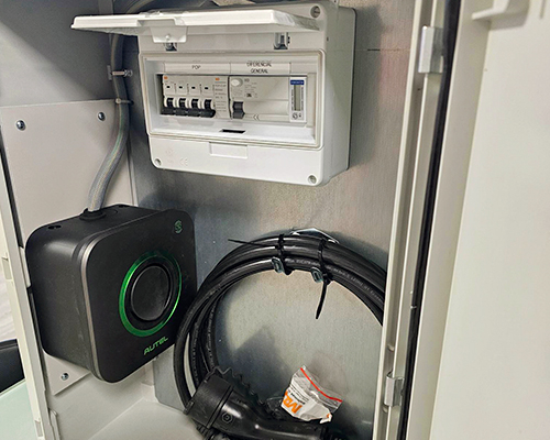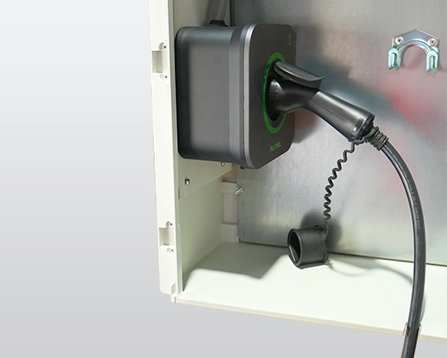 La caja incorpora las protecciones eléctricas adecuadas, correctamente dimensionadas según el tipo de instalación, reduciendo tiempos de montaje y evitando errores en obra. Permite la carga con la puerta cerrada, gracias a una salida específica para el cable de carga, manteniendo el conjunto protegido en todo momento.